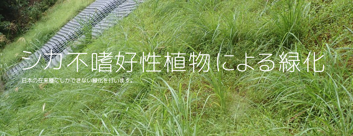 シカによる食害の影響を受ける場所で生育する植物はシカ不嗜好性植物と採餌耐性植物に区分することができます。こうした植物については様々な文献に記述がありますが、エスペックミックでは文献値を参考に、実際に法面緑化に利用できそうな植物を抽出し食害が問題となっている地域で試験施工を繰り返しています。その結果、こうした場所では日本の在来種でしかできない緑化があることが分かりました。日本には多様な植物が生育しています。そうした植物の特性を活かすことで、シカによる食害がある場所でも緑化を行うことができるようになってきました。上の写真は複数の植物を組み合わせることで緑化を行うことができた事例です。シカの食害によって生じた裸地は表土流出を誘発します。防災の観点からも、緑化が必要になります。